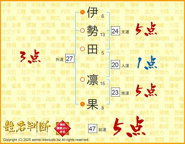 伊(6画)勢(13画)田(5画) 凛(15画)果(8画)