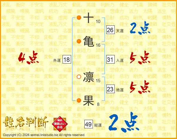 生活面を象徴する運勢です。外部から受ける影響力を表し、結婚運、家庭運や職場、環境への順応性を表します。総運から人運を引いた画数。姓や名が1文字の場合を除く。