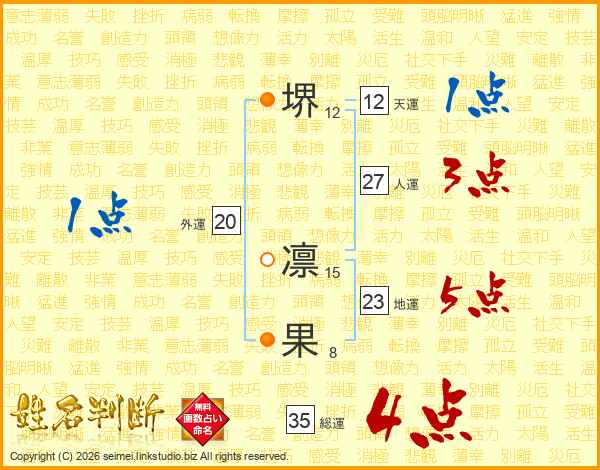 生活面を象徴する運勢です。外部から受ける影響力を表し、結婚運、家庭運や職場、環境への順応性を表します。総運から人運を引いた画数。姓や名が1文字の場合を除く。