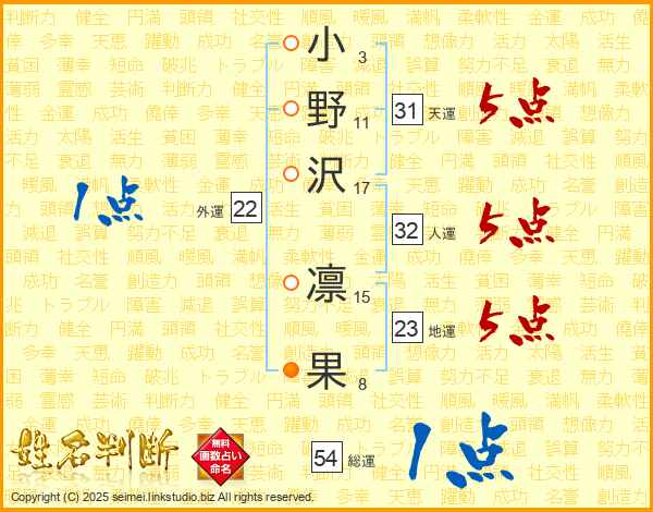 小(3画)野(11画)沢(17画) 凛(15画)果(8画)