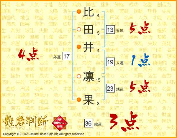比(4画)田(5画)井(4画) 凛(15画)果(8画)