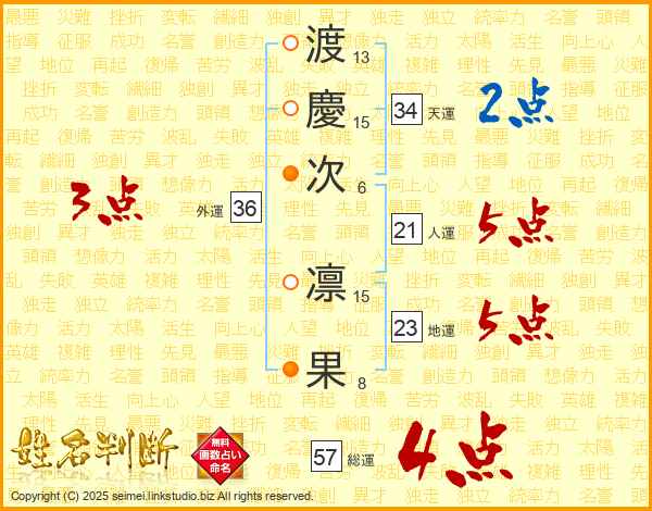 渡(13画)慶(15画)次(6画) 凛(15画)果(8画)