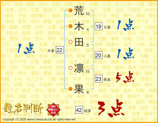 荒(10画)木(4画)田(5画) 凛(15画)果(8画)
