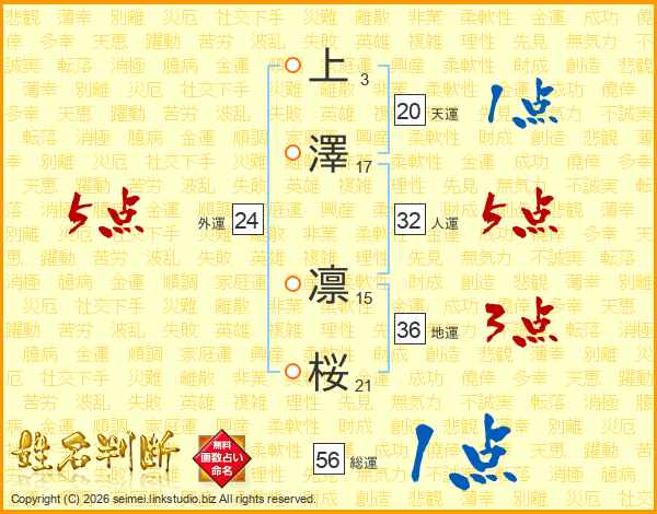 上(3画)澤(17画) 凛(15画)桜(21画)