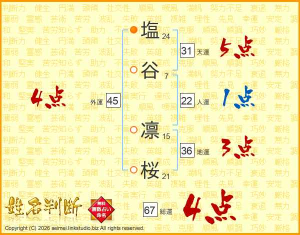 塩谷凛桜さんの総運は67画の4点!
