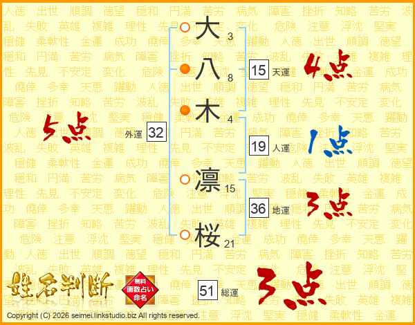 大(3画)八(8画)木(4画) 凛(15画)桜(21画)