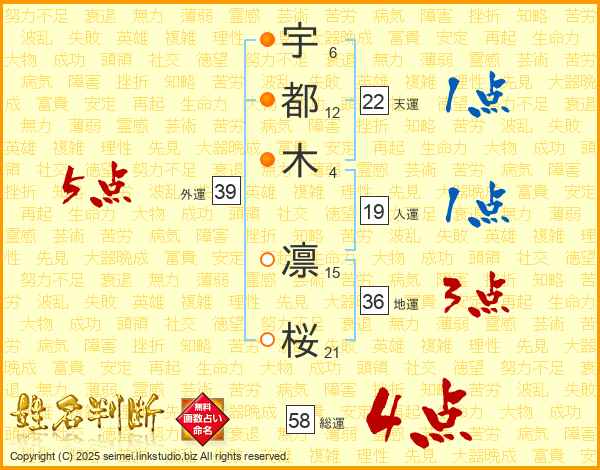 宇都木凛桜さんの総運は58画の4点!