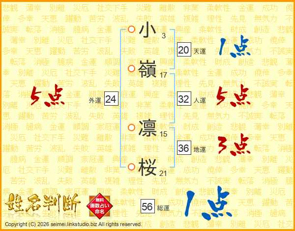 小(3画)嶺(17画) 凛(15画)桜(21画)