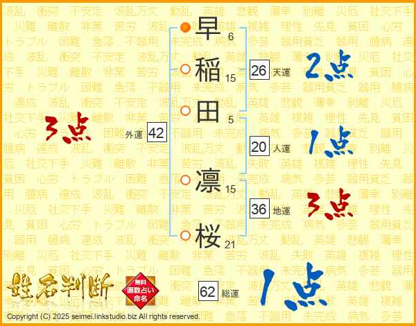 早(6画)稲(15画)田(5画) 凛(15画)桜(21画)
