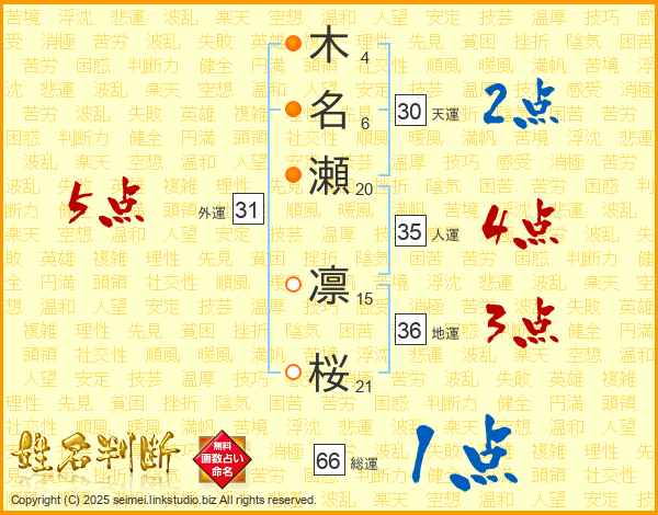 木(4画)名(6画)瀬(20画) 凛(15画)桜(21画)
