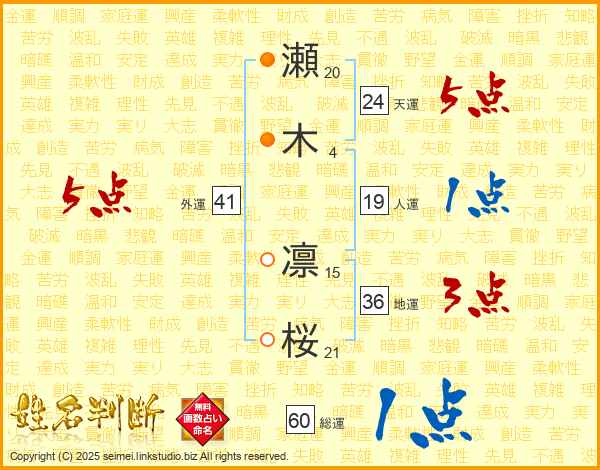 瀬(20画)木(4画) 凛(15画)桜(21画)