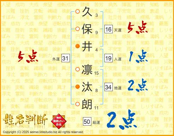 久(3画)保(9画)井(4画) 凛(15画)汰(8画)朗(11画)