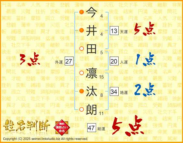 今(4画)井(4画)田(5画) 凛(15画)汰(8画)朗(11画)