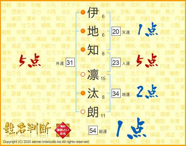 伊(6画)地(6画)知(8画) 凛(15画)汰(8画)朗(11画)