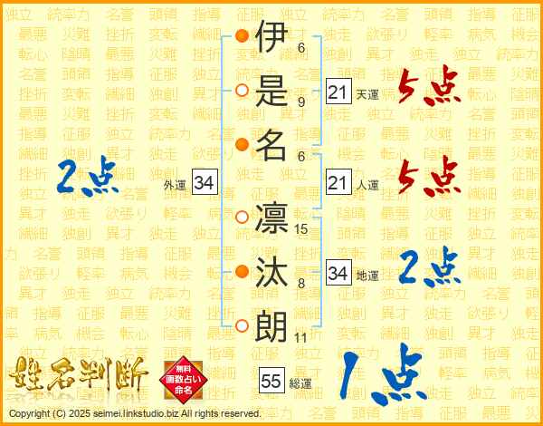 伊(6画)是(9画)名(6画) 凛(15画)汰(8画)朗(11画)