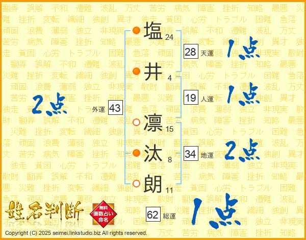 塩(24画)井(4画) 凛(15画)汰(8画)朗(11画)