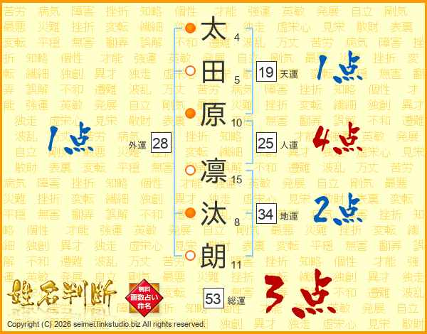 太(4画)田(5画)原(10画) 凛(15画)汰(8画)朗(11画)