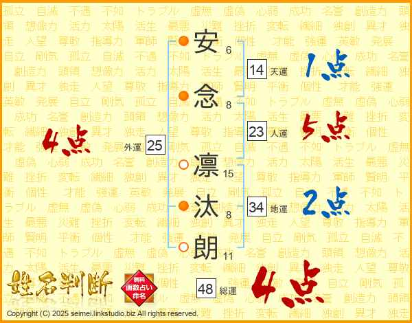 安(6画)念(8画) 凛(15画)汰(8画)朗(11画)