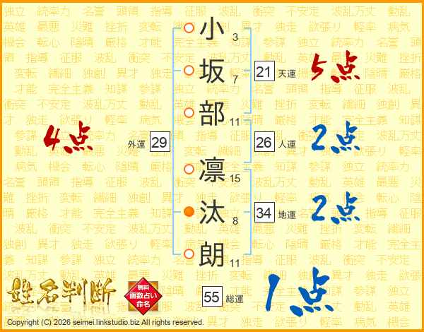 小(3画)坂(7画)部(11画) 凛(15画)汰(8画)朗(11画)