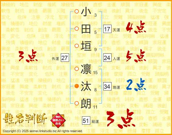 小田垣凛汰朗さんの総運は51画の3点!