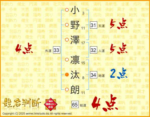 小(3画)野(11画)澤(17画) 凛(15画)汰(8画)朗(11画)