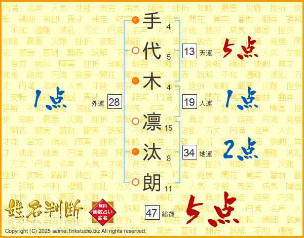 手(4画)代(5画)木(4画) 凛(15画)汰(8画)朗(11画)