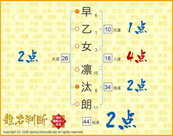 早(6画)乙(1画)女(3画) 凛(15画)汰(8画)朗(11画)