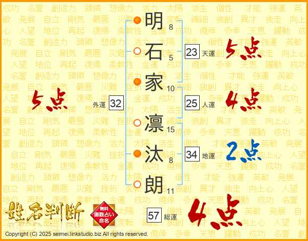 明(8画)石(5画)家(10画) 凛(15画)汰(8画)朗(11画)