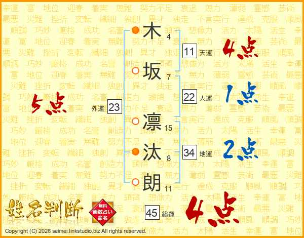 木(4画)坂(7画) 凛(15画)汰(8画)朗(11画)
