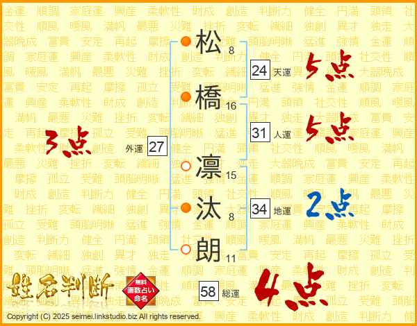 松(8画)橋(16画) 凛(15画)汰(8画)朗(11画)