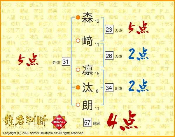森(12画)﨑(11画) 凛(15画)汰(8画)朗(11画)