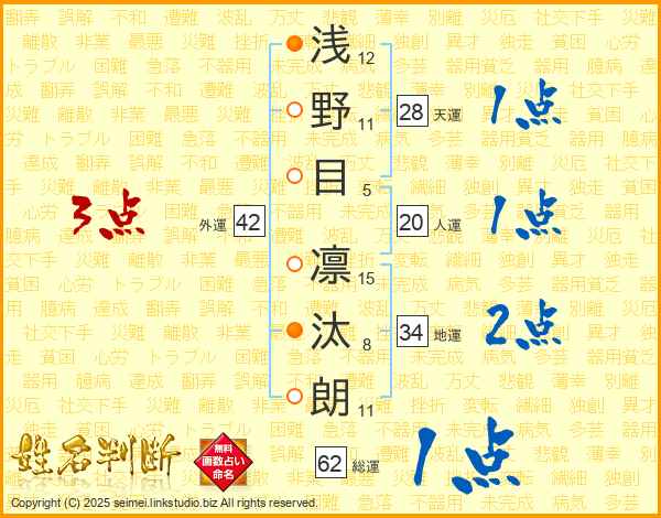 浅(12画)野(11画)目(5画) 凛(15画)汰(8画)朗(11画)