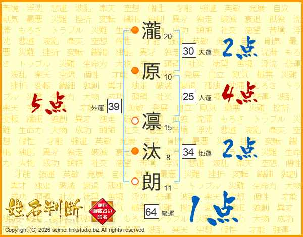 瀧(20画)原(10画) 凛(15画)汰(8画)朗(11画)