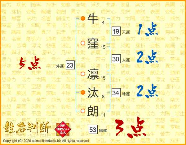 牛(4画)窪(15画) 凛(15画)汰(8画)朗(11画)
