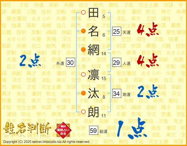 田(5画)名(6画)網(14画) 凛(15画)汰(8画)朗(11画)