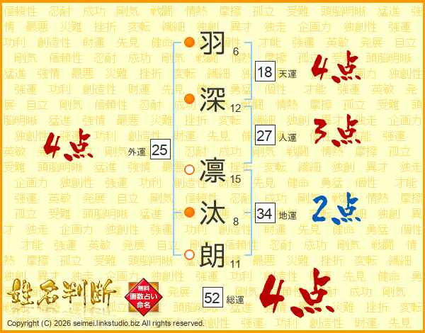 羽(6画)深(12画) 凛(15画)汰(8画)朗(11画)