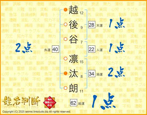 越(12画)後(9画)谷(7画) 凛(15画)汰(8画)朗(11画)