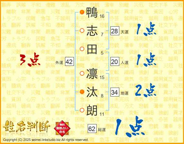 鴨(16画)志(7画)田(5画) 凛(15画)汰(8画)朗(11画)