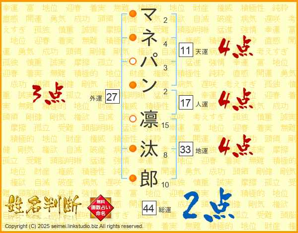 マ(2画)ネ(4画)パ(3画)ン(2画) 凛(15画)汰(8画)郎(10画)