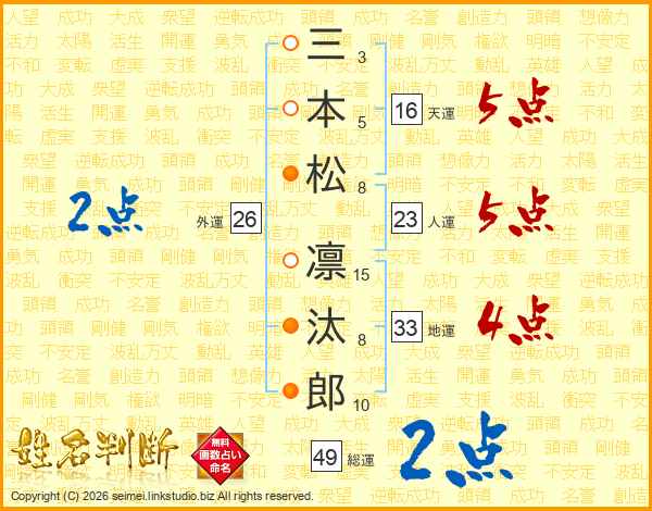 三(3画)本(5画)松(8画) 凛(15画)汰(8画)郎(10画)