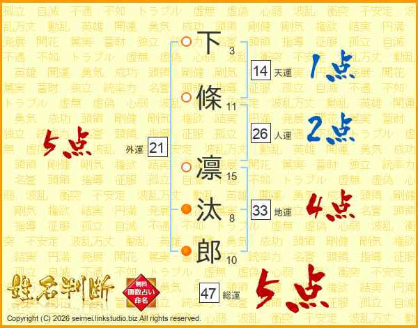 下(3画)條(11画) 凛(15画)汰(8画)郎(10画)