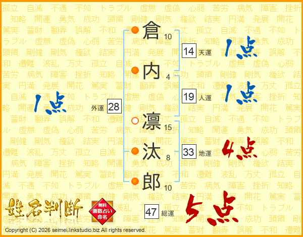 倉(10画)内(4画) 凛(15画)汰(8画)郎(10画)