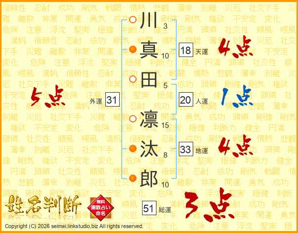 川(3画)真(10画)田(5画) 凛(15画)汰(8画)郎(10画)
