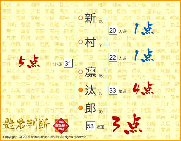 新(13画)村(7画) 凛(15画)汰(8画)郎(10画)