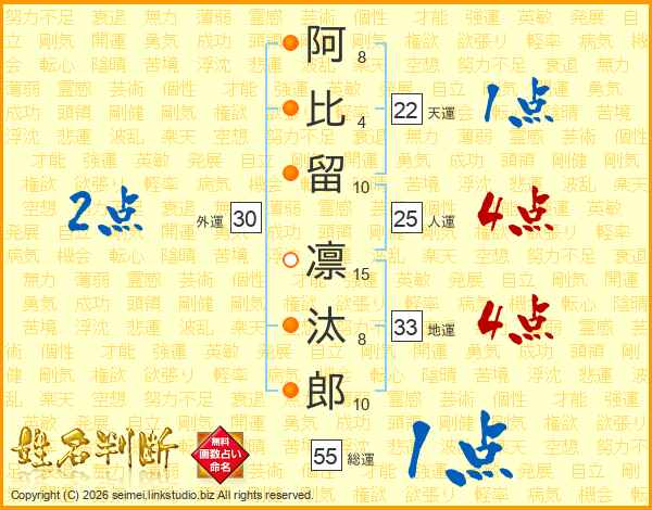 阿(8画)比(4画)留(10画) 凛(15画)汰(8画)郎(10画)