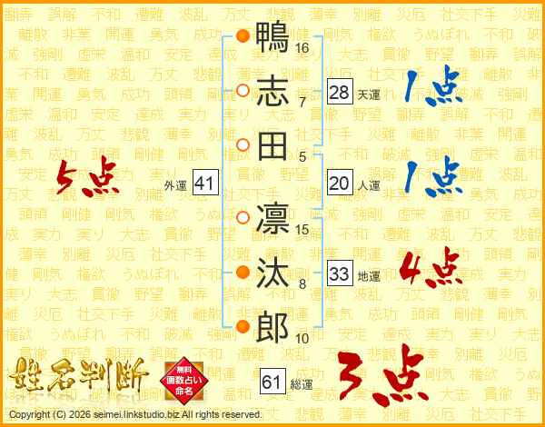 鴨(16画)志(7画)田(5画) 凛(15画)汰(8画)郎(10画)
