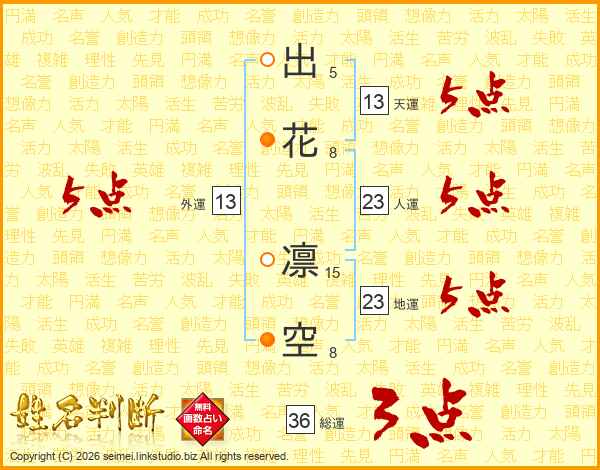 生活面を象徴する運勢です。外部から受ける影響力を表し、結婚運、家庭運や職場、環境への順応性を表します。総運から人運を引いた画数。姓や名が1文字の場合を除く。