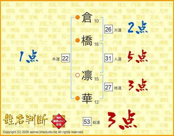 倉(10画)橋(16画) 凛(15画)華(12画)