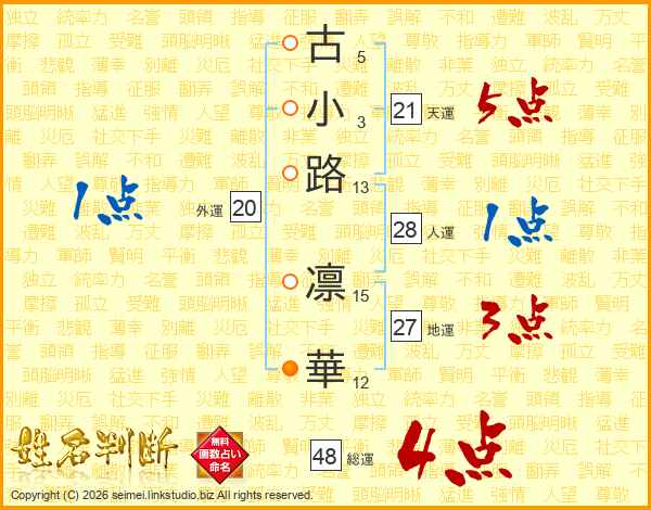 古(5画)小(3画)路(13画) 凛(15画)華(12画)