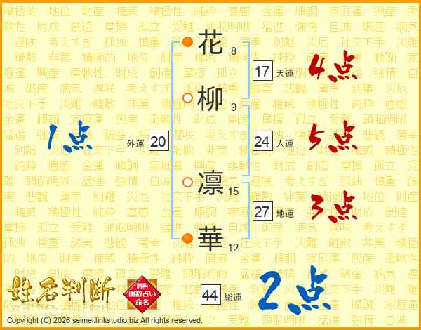 生活面を象徴する運勢です。外部から受ける影響力を表し、結婚運、家庭運や職場、環境への順応性を表します。総運から人運を引いた画数。姓や名が1文字の場合を除く。